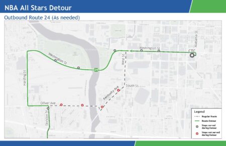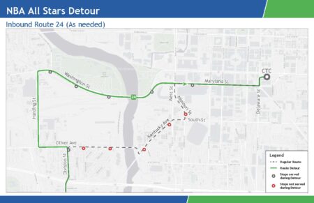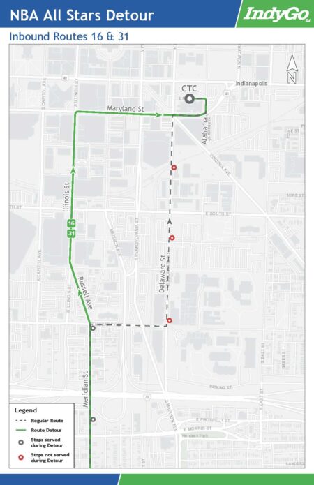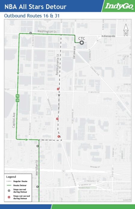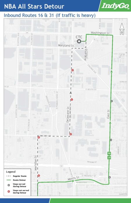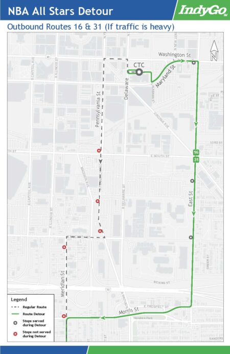 Below is a list of potential detours IndyGo will implement during the NBA All-Star 2024 festivities, Feb. 15-18. This page may be updated as traffic patterns change, so check back regularly for new information.