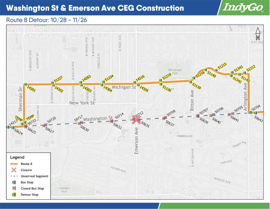 During this closure, Washington Street will be closed from State to Emerson avenues. Buses will detour around the closure using State Avenue, New York Street and Emerson Avenue. Stops 50610, 50613, 50615, 50616, 60618, 50621, 50622, 50624, 50625, 50627, 50630 and 50633 will be closed. One temporary stop is located on State Avenue and 11 temporary stops are located along New York Street.