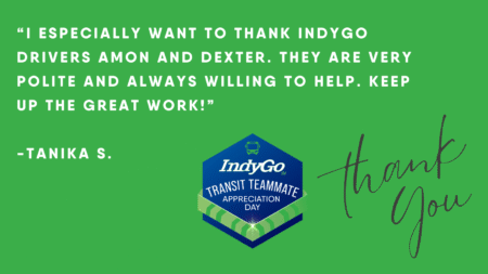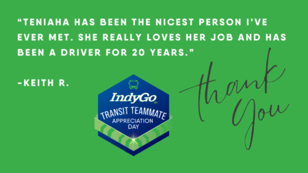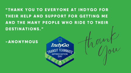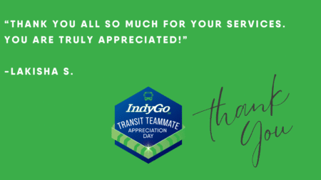One of the best ways to publicly show your appreciation for a specific IndyGo teammate or our services in general is by submitting to our Transit Teammate Appreciation Form below. We celebrate these messages internally and on social media to let our essential workers know they’re special and their work is being recognized not only by us, but by all of you! Click the button below to submit your appreciation note. (You can find examples of previous riders’ comments below in the IndyGo Rider Shoutouts section.)